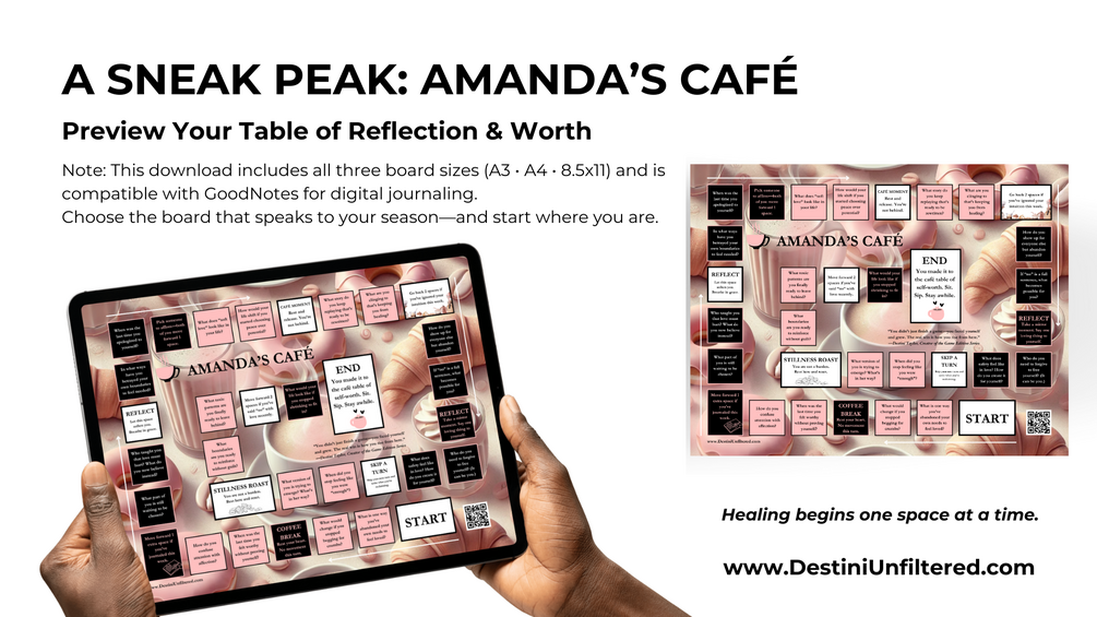 Amanda’s Café is a printable self-worth board game designed to guide you through powerful reflections on healing, boundaries, and emotional clarity. Whether you’re journaling solo or sharing with a friend, each space invites honest conversation and intentional growth. Cozy, transformative, and beautifully designed—this is where your healing journey takes a seat at the table.