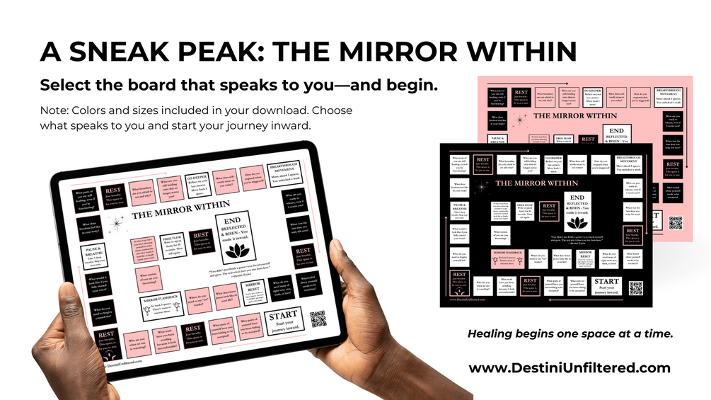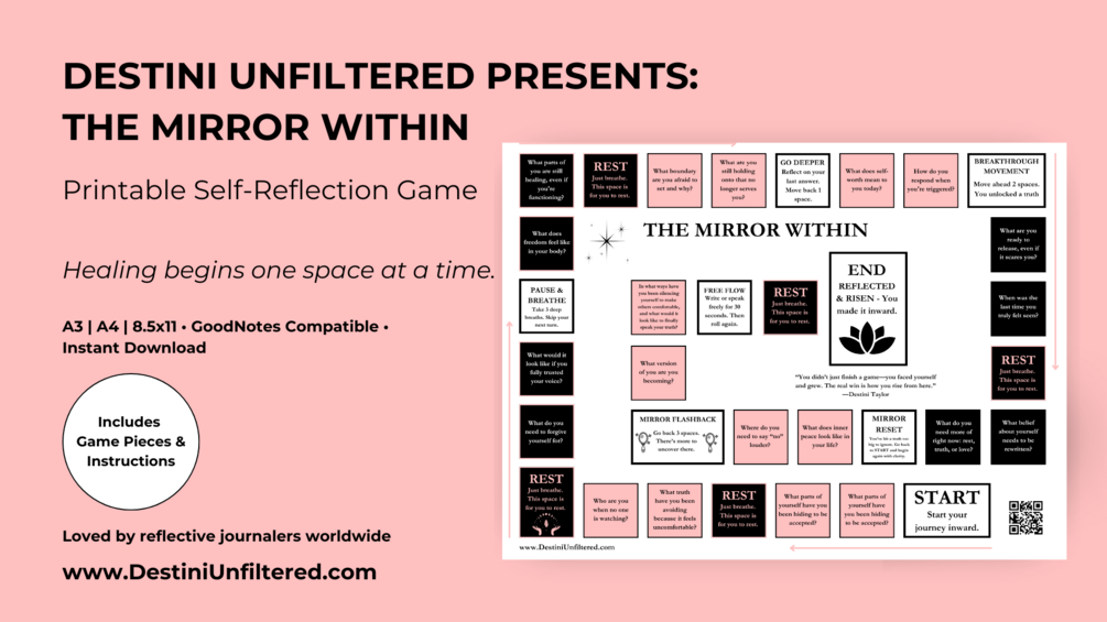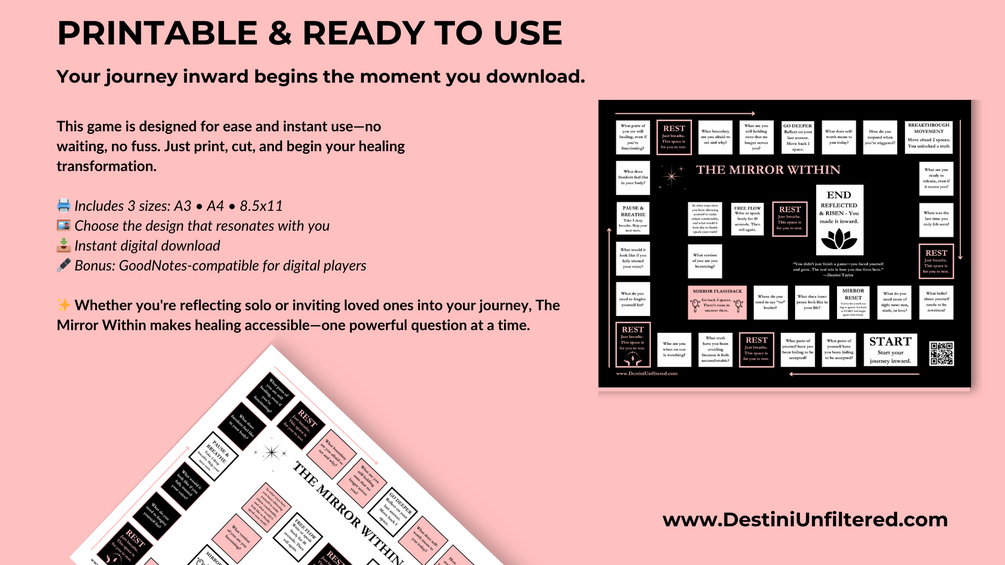The Mirror Within is a printable self-reflection board game designed to help you slow down, reconnect, and heal—one intentional space at a time. Perfect for journaling, solo or group play, this digital game includes guided prompts that deepen self-awareness and emotional growth. Use it with a physical die or in GoodNotes with the included digital game pieces.