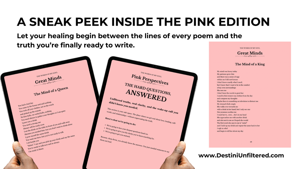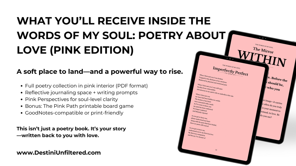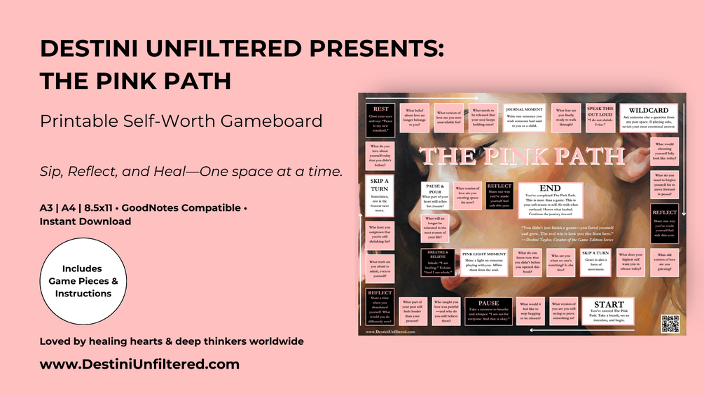 Subscribe to the Destini Unfiltered newsletter at DestiniUnfiltered.com to unlock a library of self-reflection games, printable healing tools, and early access to new releases before they’re available anywhere else.