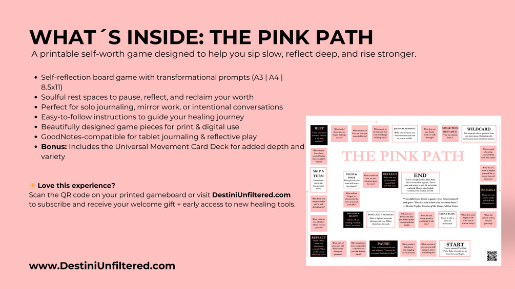 Designed as a printable self-reflection tool, The Pink Path leads you through 33 intentional spaces filled with transformational prompts, sacred pauses, and soulful checkpoints. Whether you’re in a season of healing, rediscovering your self-worth, or simply craving a moment of meaningful connection—with yourself or with others—this game invites you to slow down, soften, and grow.