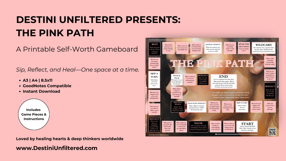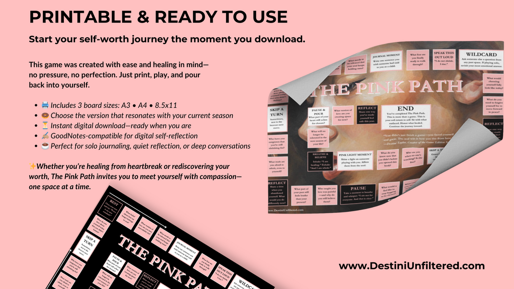 Designed as a printable self-reflection tool, The Pink Path leads you through 33 intentional spaces filled with transformational prompts, sacred pauses, and soulful checkpoints. Whether you’re in a season of healing, rediscovering your self-worth, or simply craving a moment of meaningful connection—with yourself or with others—this game invites you to slow down, soften, and grow.